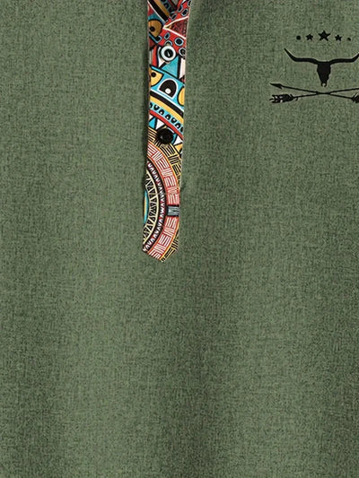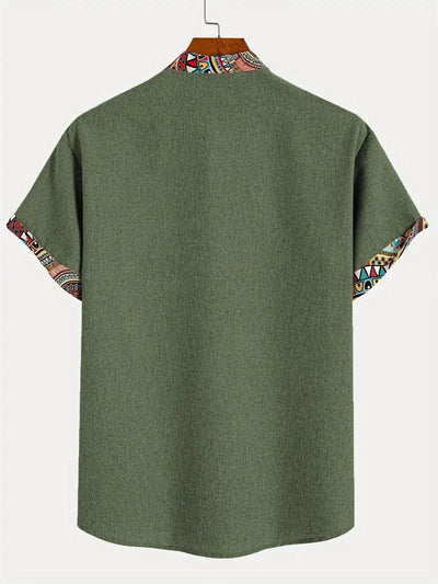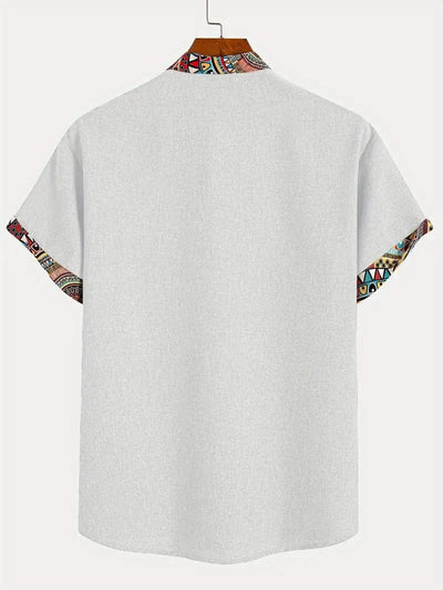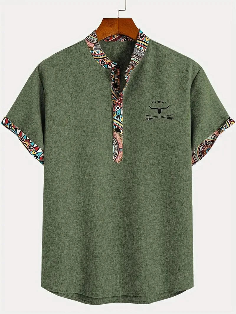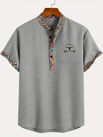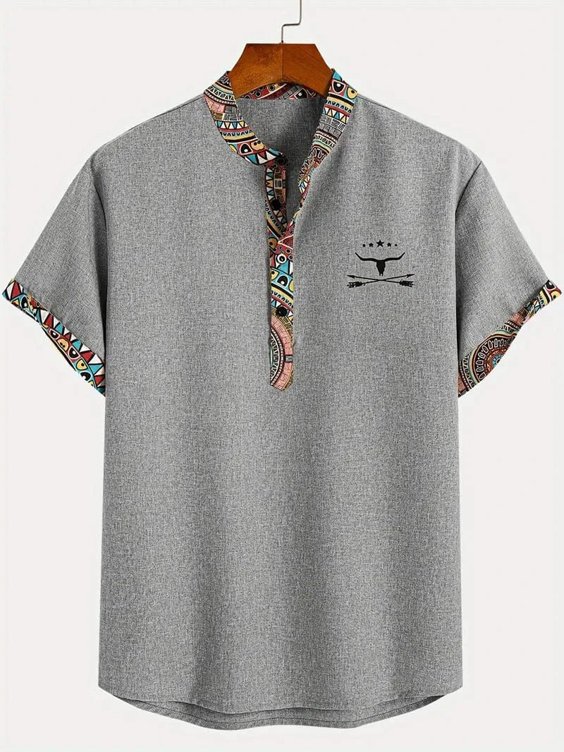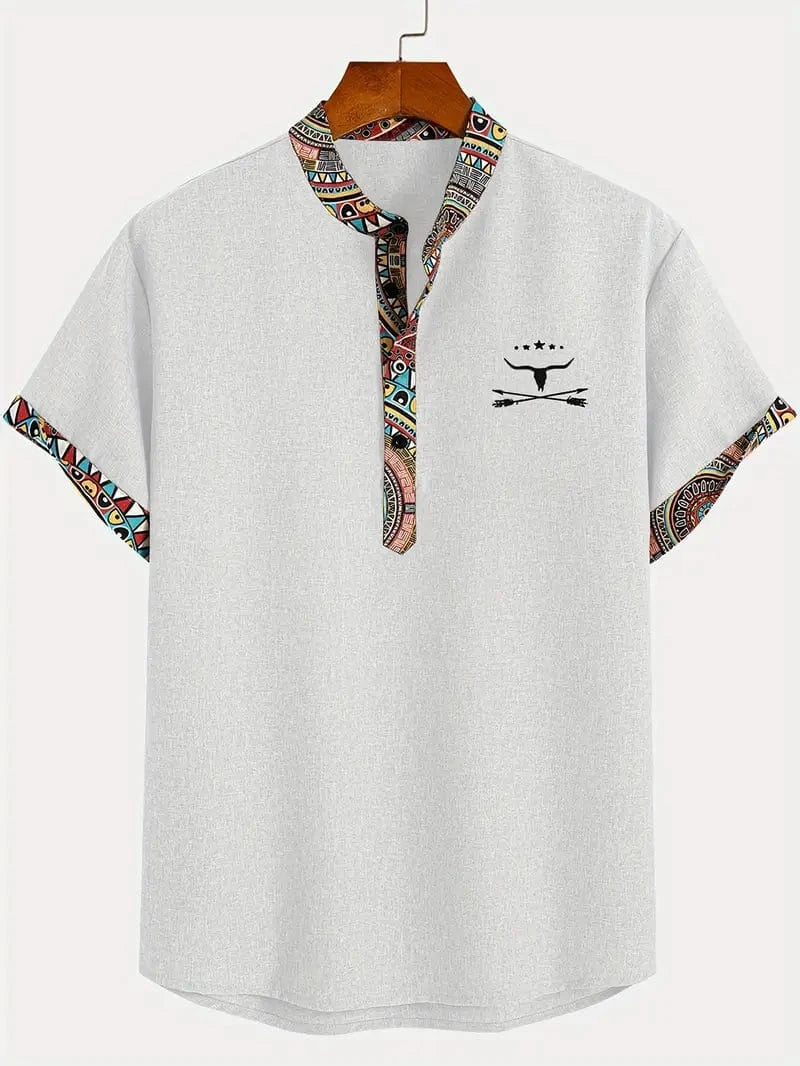 Cut through the noise with the rugged spirit of the frontier stitched right into your collar. The tribal trim nods to ancient stories, while the sun-bleached cotton keeps you cool through high noon heat and dust-kicked wanderings. A shirt made for wide skies, open roads, and men who still shake hands like they mean it.