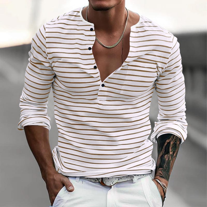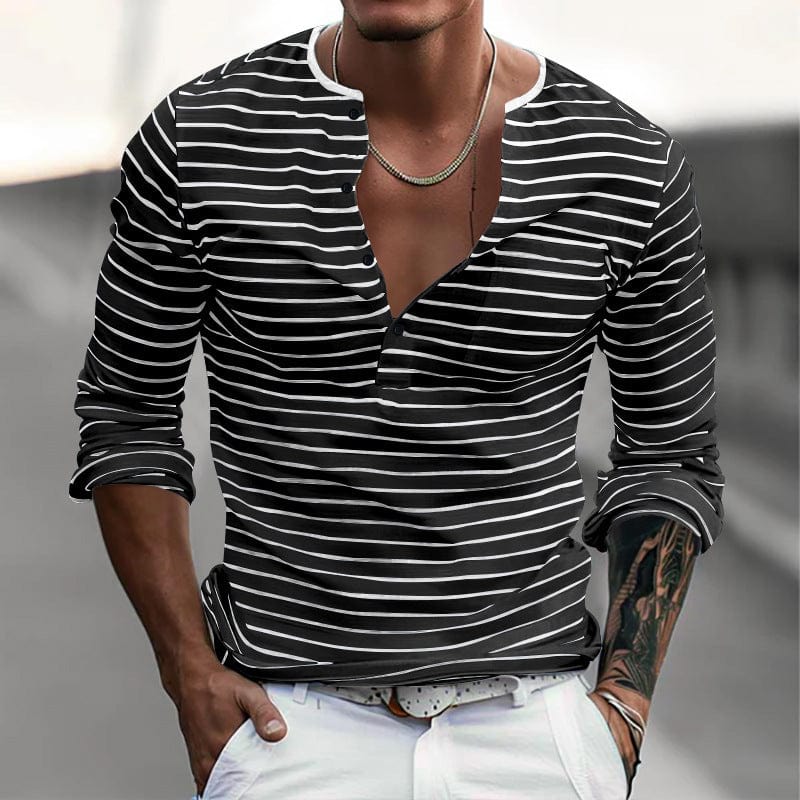 Crafted for laid-back refinement, the Marceau tee brings classic French Riviera vibes to your everyday wardrobe. With its horizontal stripes and relaxed Henley neckline, it delivers just the right dose of effortless cool. The soft, breathable fabric drapes naturally while the buttoned placket adds a touch of tailored edge—perfect for the modern man who values comfort without compromising style.
