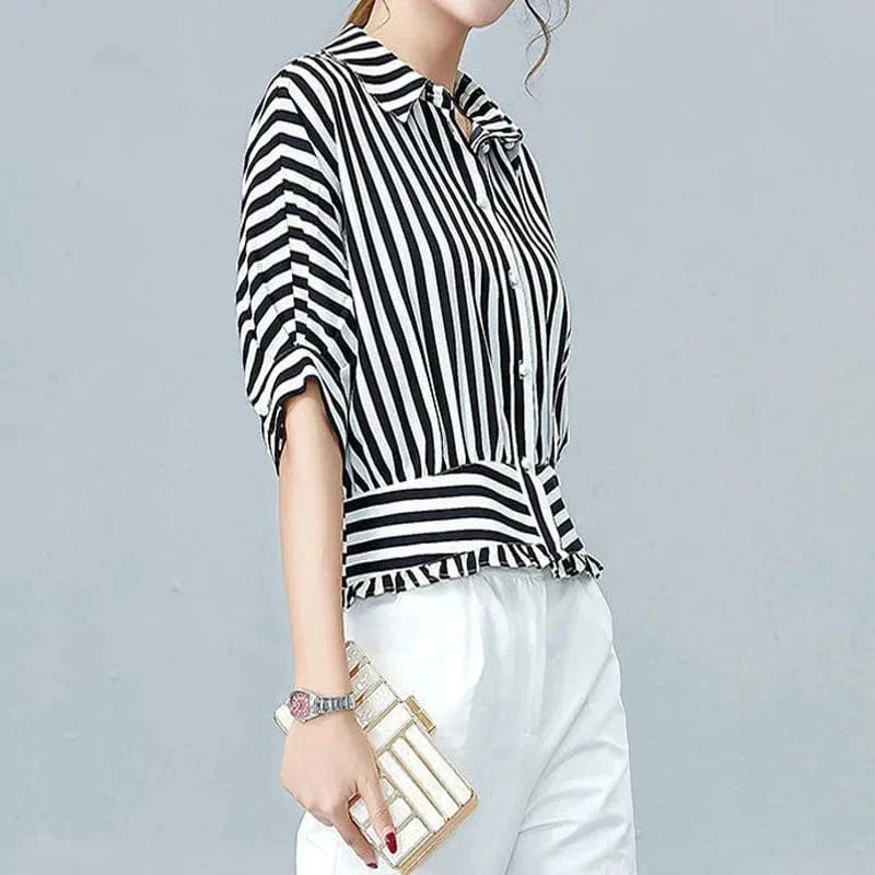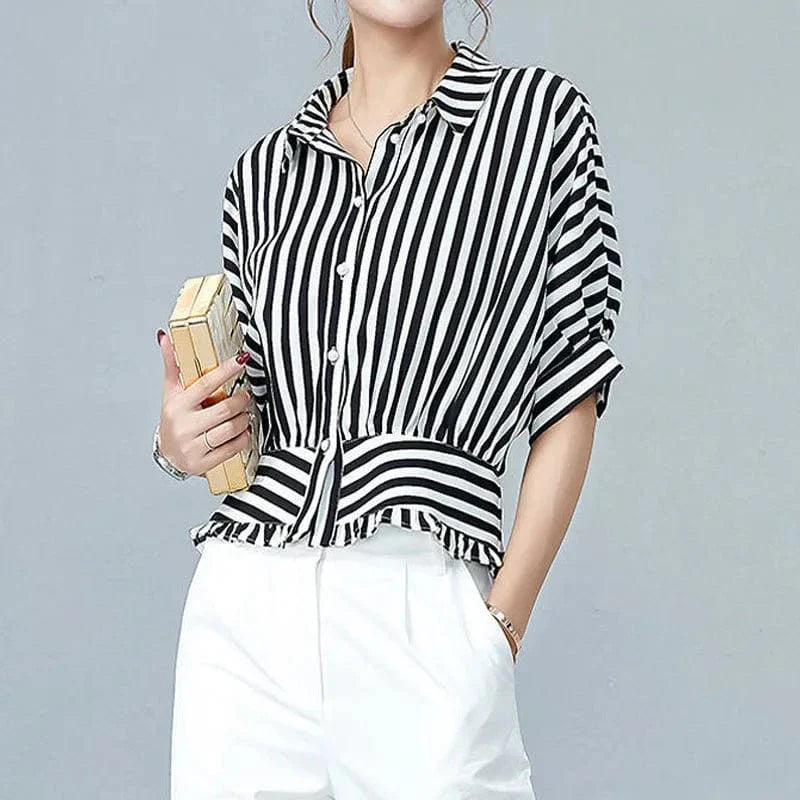 With its figure-defining waistband, soft ruffle hem, and contrast stripe detailing, this blouse delivers instant sophistication without sacrificing comfort. Whether tucked into crisp trousers or paired with weekend denim, Mirelle gives you the power to dress up or down with effortless polish.