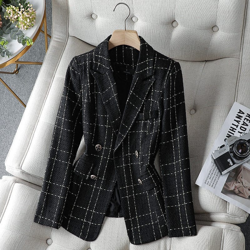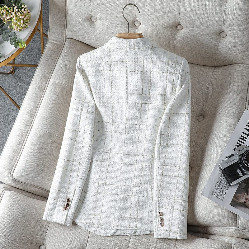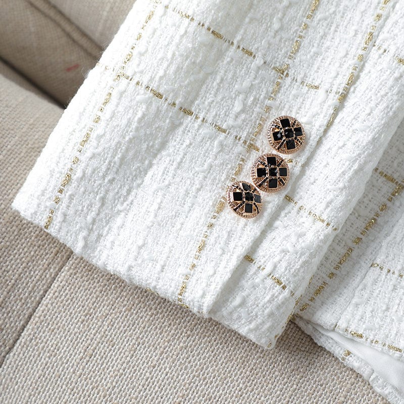 • Tweed-inspired texture and gold-thread check pattern lend a couture touch to everyday tailoring